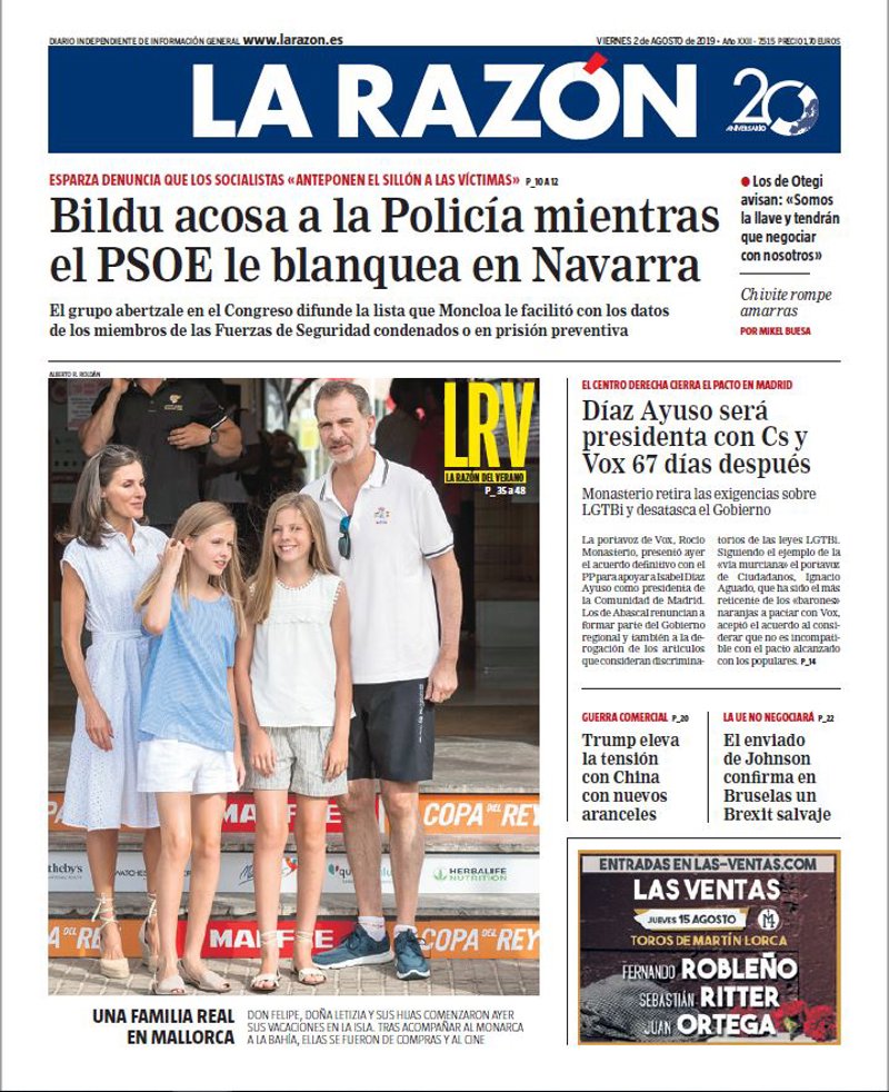 LA RAZÓN: "Bildu acosa a la Policía mientras el PSOE le blanquea en Navarra"; "Una familia real en Mallorca"; "Díaz Ayuso será presidenta con Cs y Vox 67 días después"; "Trump eleva la tensión con China con nuevos aranceles"; "El enviado de Johnson confirma en Bruselas un Brexit salvaje".