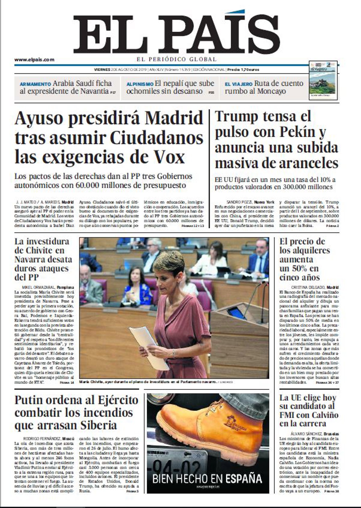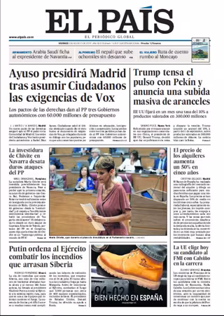 EL PAÍS: "Ayuso presidirá Madrid tras asumir Ciudadanos las exigencias de Vox"; "Trump tensa el pulso con Pekín y anuncia una subida masiva de aranceles"; "La investidura de Chivite en Navarra desata duros ataques del PP"; "El precios de los alquileres aumenta un 50% en cinco años"; "Putin ordena al Ejército combatir los incendios que arrasan Siberia"; "La UE elige hoy su candidato al FMI con Calviño en la carrera".