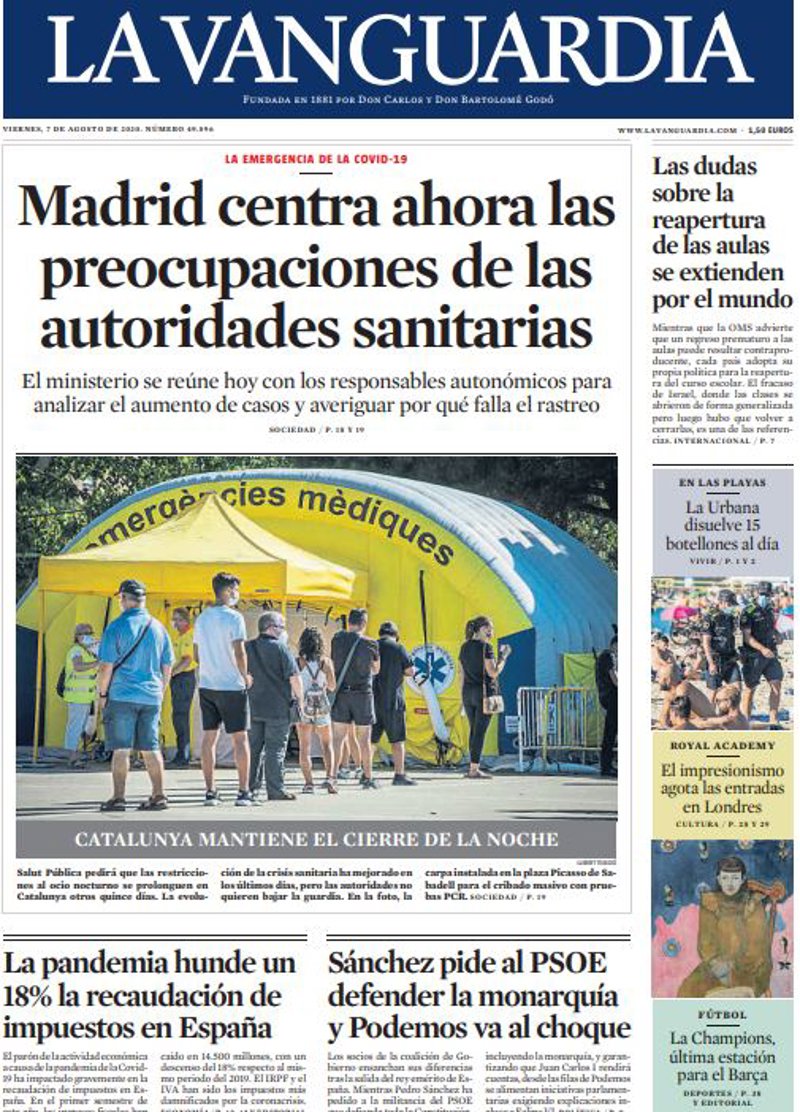 LA VANGUARDIA: "Madrid centra ahora las preocupaciones de las autoridades sanitarias"; "La pandemia hunde un 18% la recaudación de impuestos en España"; "Sánchez pide al PSOE defender la monarquía y Podemos va al choque"; "Las dudas sobre la reapertura de las aulas se extienden por el mundo".