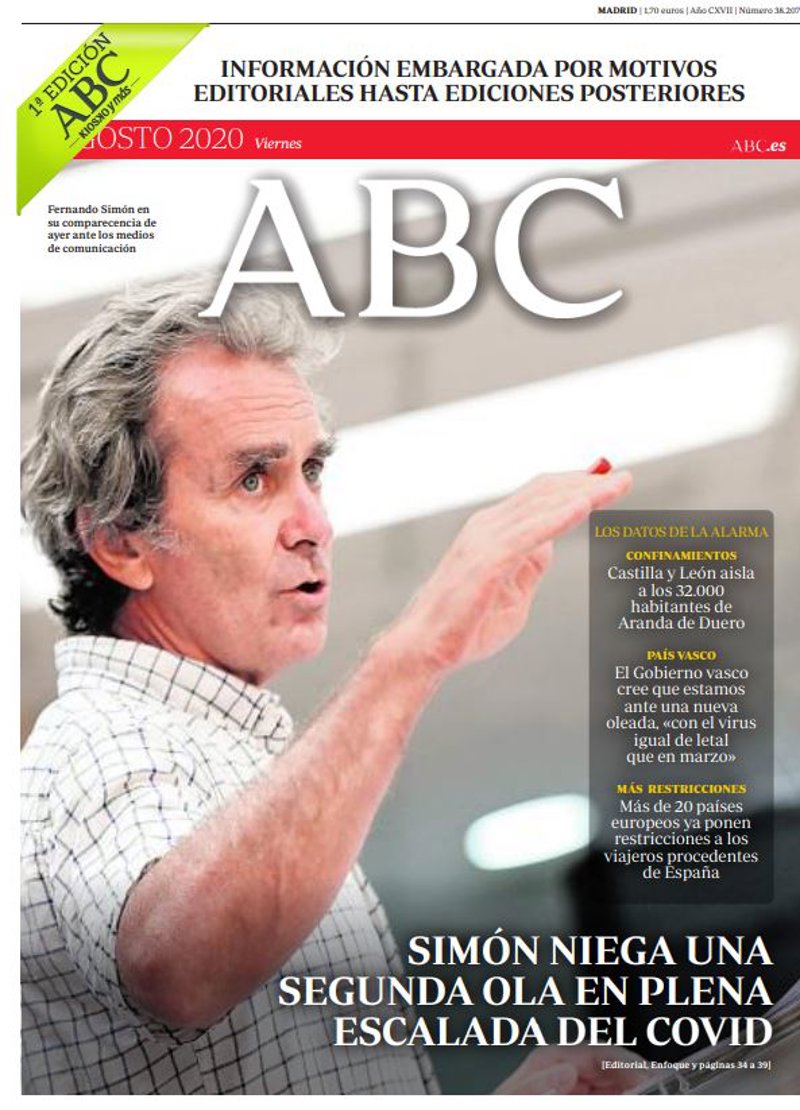 ABC: "Simón niega una segunda ola en plena escalada del Covid. Castilla y León aisla a los 32.000 habitantes de Aranda de Duero. El Gobierno vasco cree que estamos ante una nueva oleada, "con el virus igual de letal que en marzo". Más de 20 países europeos ya ponen restricciones a los viajeros procedentes de España".
