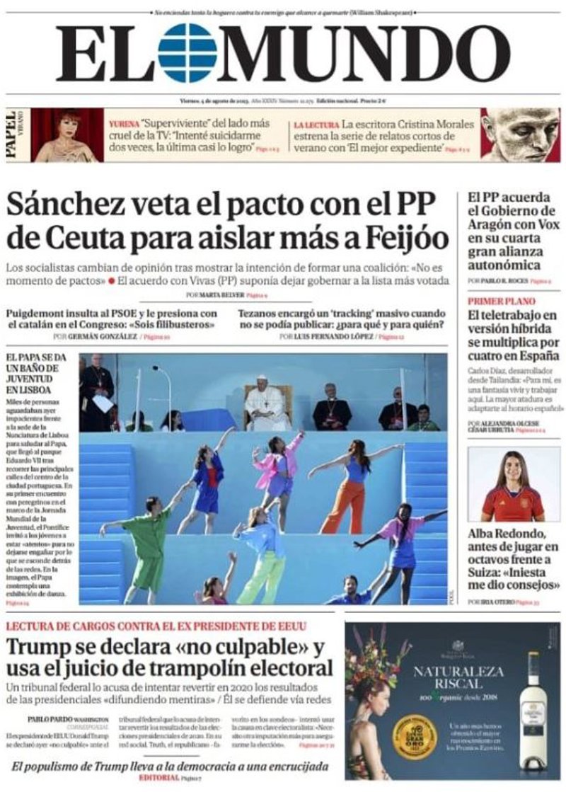 EL MUNDO: "Sánchez veta el pacto con el PP de Ceuta para aislar más a Feijóo"; "Trump se declara "no culpable" y usa el juicio de trampolín electoral"; "El PP acuerda el Gobierno de Aragón con Vox en su cuarta gran alianza autonómica"; "El teletrabajo en versión híbrida se multiplica por cuatro En España"; "Alba Redondo, antes de jugar en octavos frente a Suiza: "Iniesta me dio consejos"".