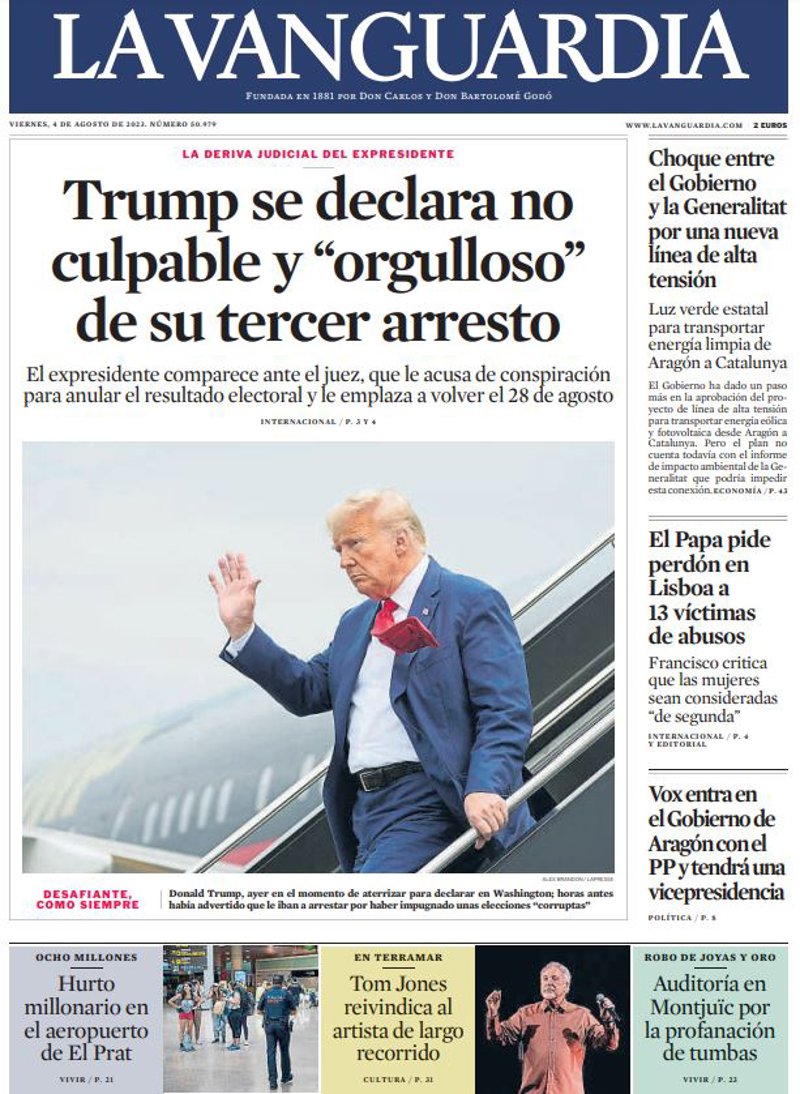LA VANGUARDIA: "Trump se declara no culpable y "orgulloso" de su tercer arresto"; "Choque entre el Gobierno y la Generalitat por una nueva línea de alta tensión"; "El Papa pide perdón en Lisboa a 13 víctimas de abusos"; "Vox entra en el Gobierno de Aragón con el PP y tendrá una vicepresidencia".