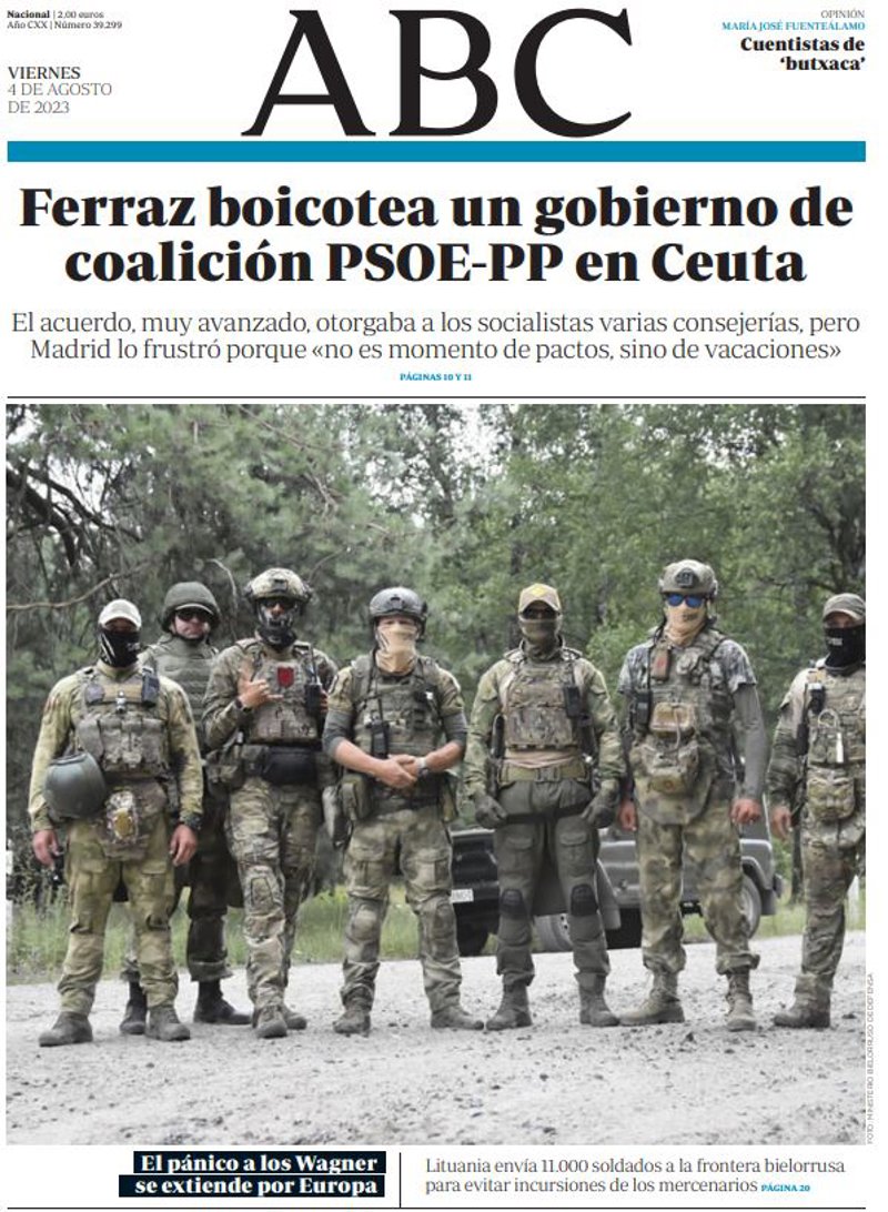 ABC: "Ferraz boicotea un gobierno de coalición PSOE-PP en Ceuta. El acuerdo, muy avanzado, otorgaba a los socialistas varias consejerías, pero Madrid lo frustró porque "no es momento de pactos, sino de vacaciones""; "El pánico a los Wagner se extiende por Europa. Lituania envía 11.000 soldados a la frontera bielorrusa para evitar incursiones de los mercenarios".