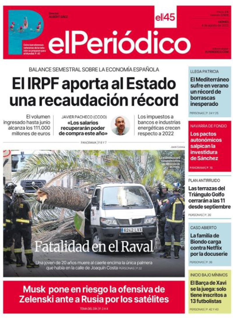 EL PERIÓDICO: "El IRPF aporta al Estado una recaudación récord"; "Fatalidad en el Raval"; "Musk pone en riesgo la ofensiva de Zelenski ante Rusia por los satélites"; "El Mediterráneo sufre en verano un récord de borrascas inesperado"; "Los pactos autonómicos salpican la investidura de Sánchez"; "Los terrazas del Triángulo Golfo cerrarán a las 11 desde septiembre"; "La familia de Biondo carga contra Netflix por la docuserie".