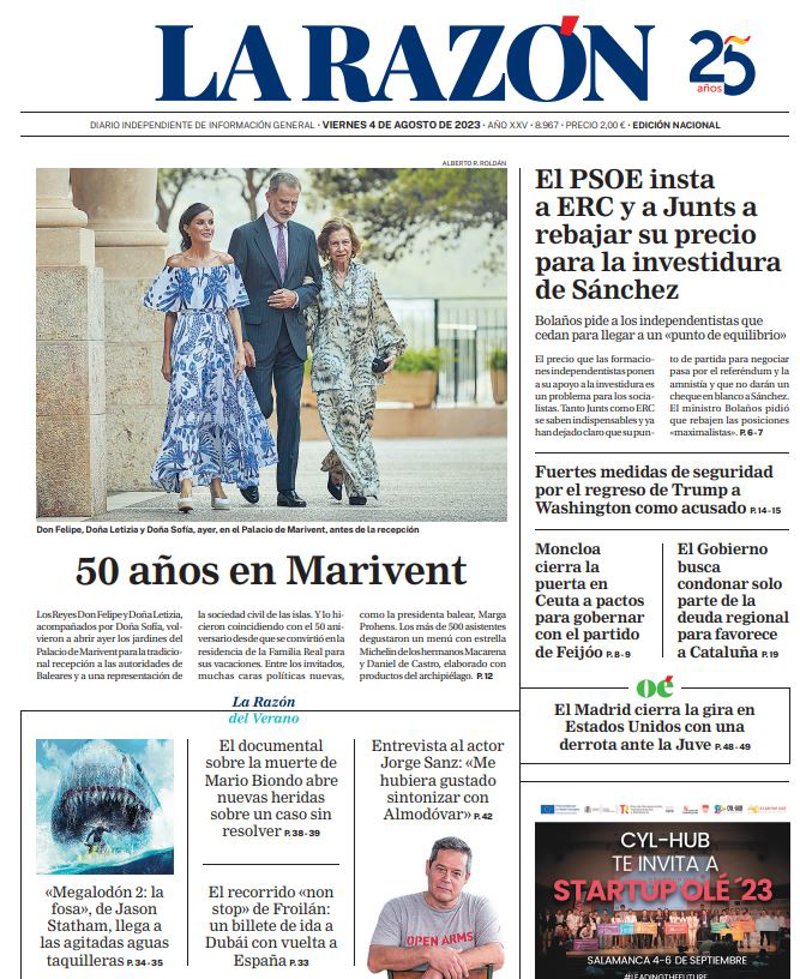 LA RAZÓN: "50 años en Marivent"; "El PSOE insta a ERC y a Junts a rebajar su precio para la investidura de Sánchez"; "Fuertes medidas de seguridad por el regreso de Trump a Washington como acusado"; "Moncloa cierra la puerta en Ceuta a pactos para gobernar con el partido de Feijóo"; "El Gobierno busca condonar solo parte de la deuda regional para favorece a Cataluña"; "El Madrid cierra la gira en Estados Unidos con una derrota ante la Juve".