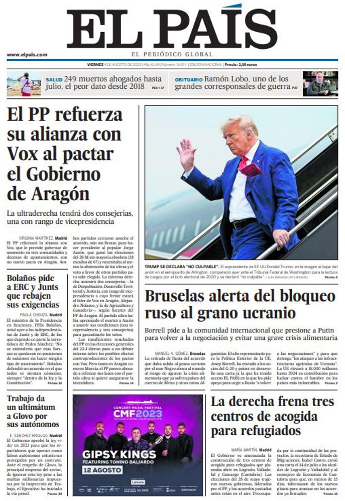 EL PAÍS: "El PP refuerza su alianza con Vox al pactar el Gobierno de Aragón"; "Bruselas alerta del bloqueo ruso al grano ucranio"; "La derecha frena tres centros de acogida para refugiados"; "Bolaños pide a ERC y Junts que rebajen sus exigencias"; "Trabajo da un ultimátum a Glovo por sus autónomos".