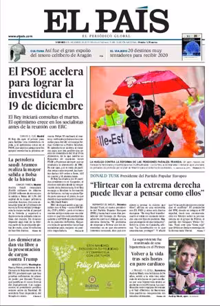 EL PAÍS: "El PSOE acelera para lograr la investidura el 19 de diciembre"; "La huelga contra la reforma de las pensiones paraliza Francia"; "Donald Tusk, presidente del Partido Popular Europeo: "Flirtear con la extrema derecha puede llevar a pensar como ellos""; "Volver a la vida tras seis horas en paro cariaco"; "La petrolera saudí Aramco realiza la mayor salida a Bolsa de su historia"; "Los demócratas dan vía libre a la presentación de cargos contra Trump".