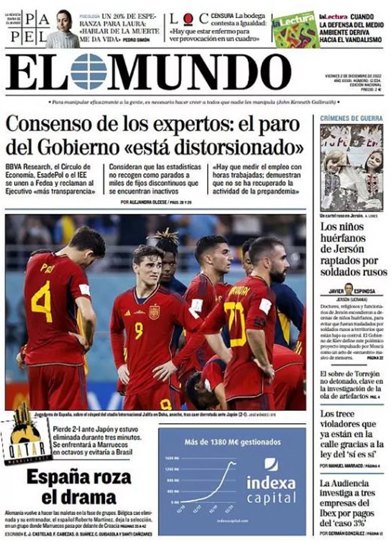 EL MUNDO: "Consenso de los expertos: el paro del Gobierno "está distorsionado""; "España roza el drama"; "Los niños huérfanos de Jersón raptados por soldados rusos"; "El sobre de Torrejón no detonado, clave en la investigación de la ola de artefactos"; "Los trece violadores que ya están en la calle gracias a la ley del 'sí es sí'"; "La Audiencia investiga a tres empresas del Ibes por pagos del 'caso 3%'".