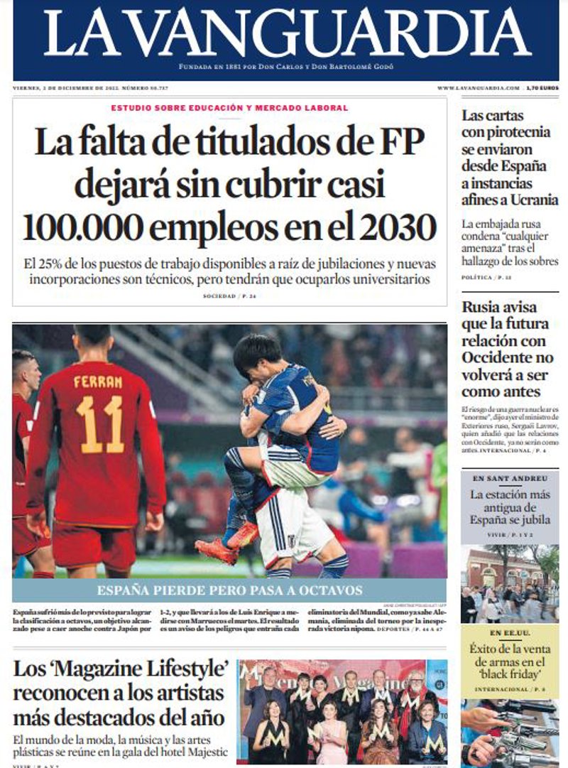 LA VANGUARDIA: "La falta de titulados de FP dejará sin cubrir casi 100.000 empleos en el 2030"; "Los 'Magazine Lifestyle' reconocenalos artistas más destacados del año"; "Las cartas con pirotecnia se enviaron desde España a instancias afines a Ucrania"; "Rusia avisa