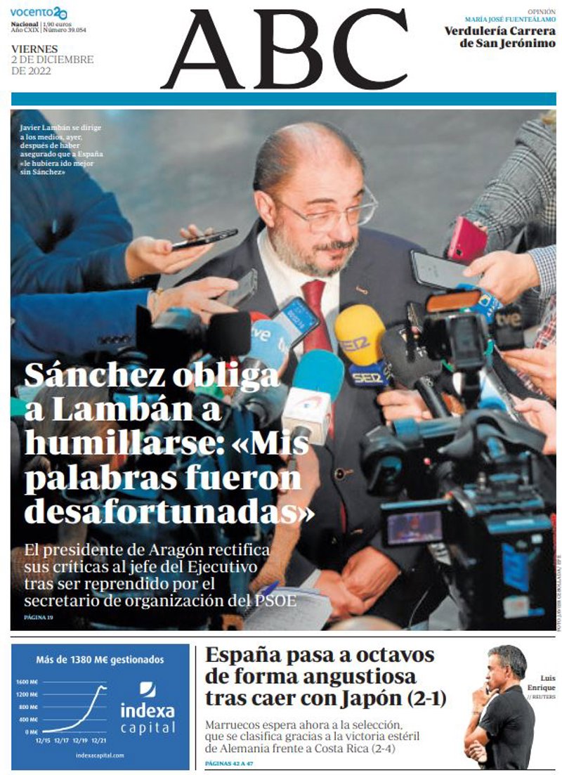 ABC: "Sánchez obliga a Lambán a humillarse: "Mis palabras fueron desafortunadas""; "España pasa a octavos de forma angustiosa tras caer con Japón (2-1)".