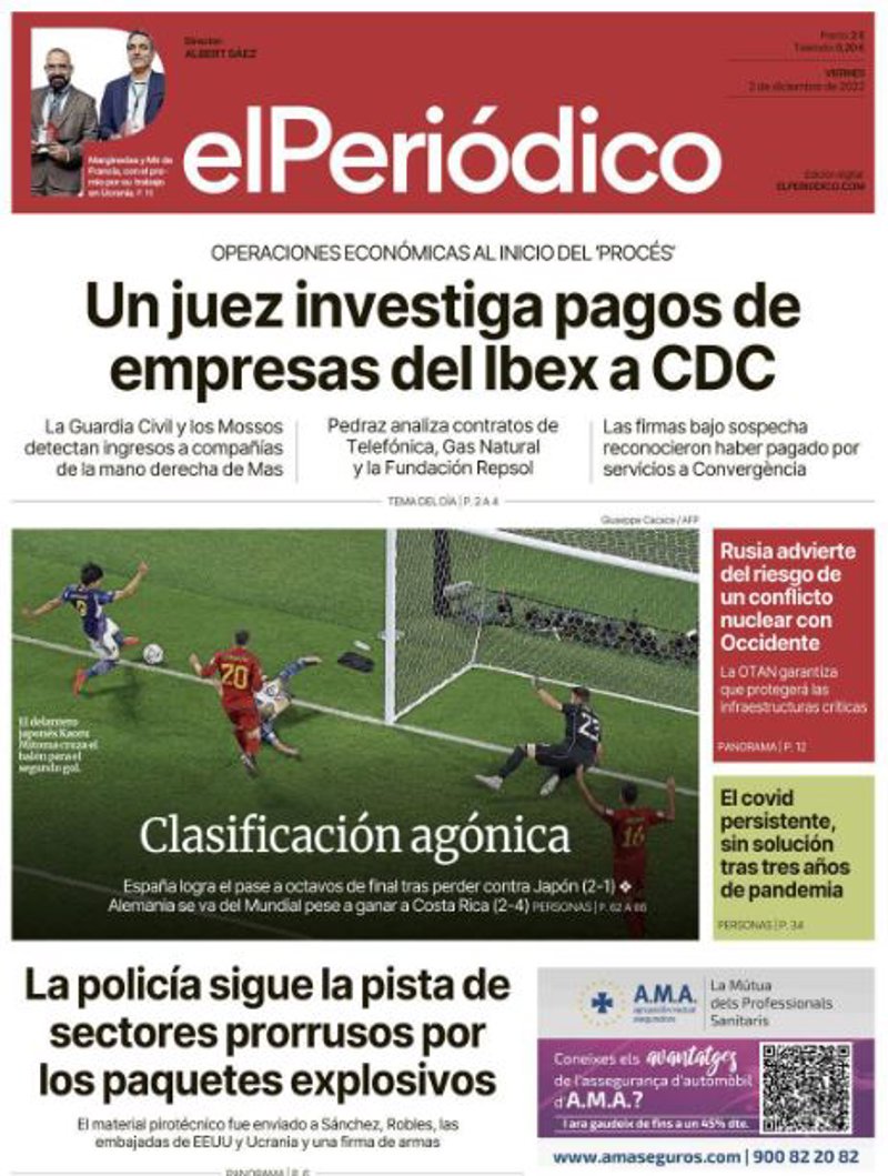 EL PERIÓDICO: "Un juez investiga pagos de empresas del Ibex a CDC"; "Clasificación agónica"; "La policía sigue la pista de sectores prorrusos por los paquetes explosivos"; "Rusia advierte del riesgo de un conflicto nuclear con Occidente"; "El covid persistente, sin solución tras tres años de pandemia".