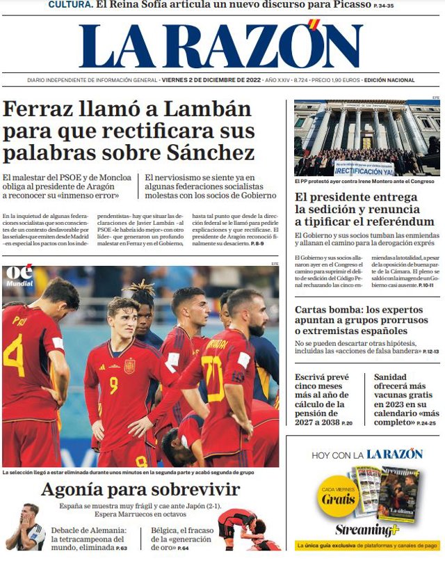 LA RAZÓN: "Ferraz llamó a Lambán para que rectificara sus palabras sobre Sánchez"; "Agonía para sobrevivir"; "El presidente entrega la sedición y renuncia a tipificar el referéndum"; "Cartas bomba: los expertos apuntan a grupos prorrusos o extremistas españoles"; "Escrivá prevé cinco meses más al año de cálculo de la pensión de 2027 a 2038".