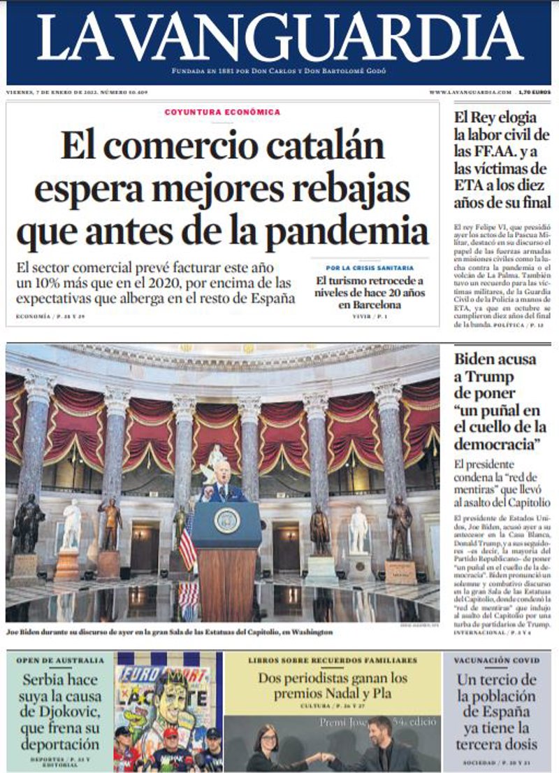 LA VANGUARDIA: "El comercio catalán espera mejores rebajas que antes de la pandemia"; "El Rey elogia la labor civil de las FF.AA. y a las víctimas de ETA a los diez años de su final"; "Biden acusa a Trump de poner "un puñal en el cuello de la democracia""; "Serbia hace suya la causa de Djokovic, que frena su deportación"; "Dos periodistas ganan los premios Nadal y Pla"; "Un tercio de la población de España ya tiene la tercera dosis".