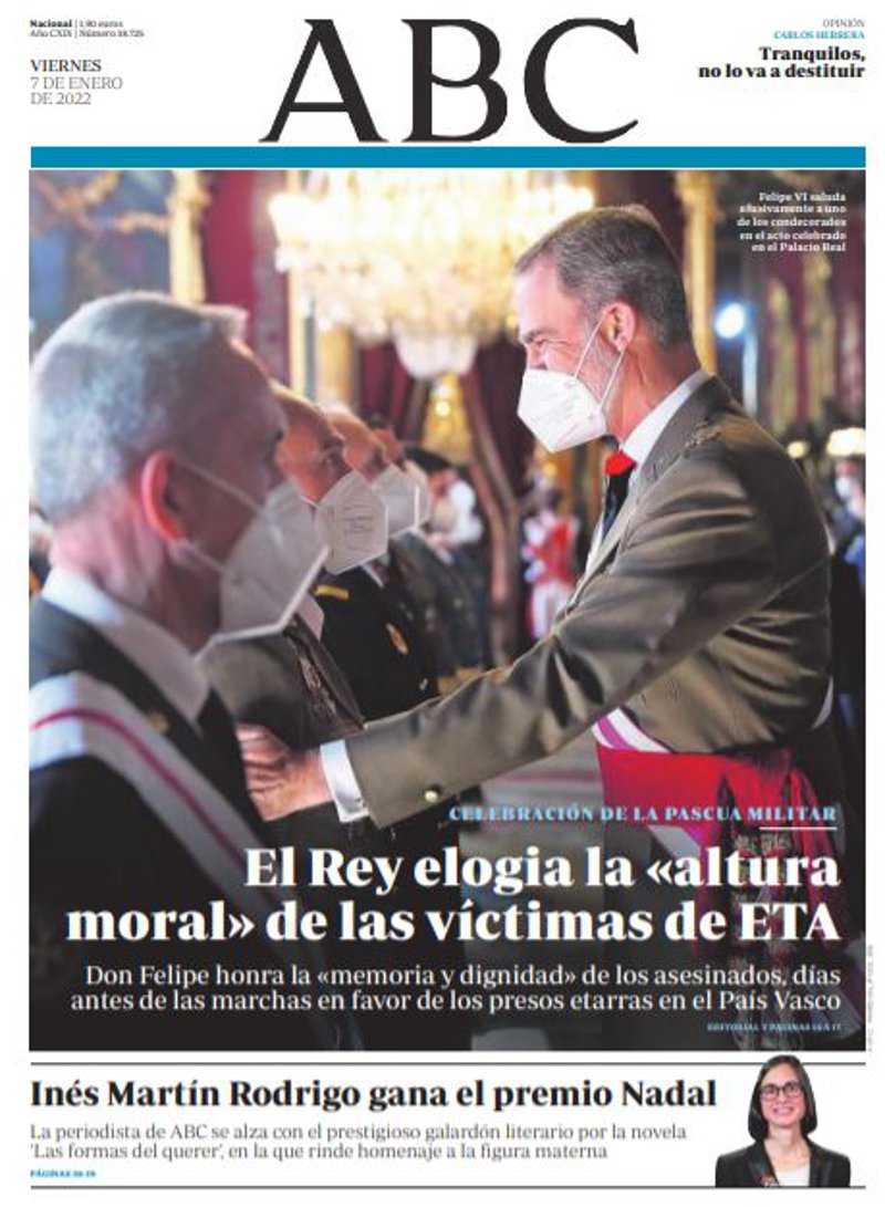 ABC: "El Rey elogia la "altura moral" de las víctimas de ETA. Don Felipe honra la "memoria y dignidad" de los asesinados, días antes de las marchas en favor de los presos etarras en el País Vasco"; "Inés Martín Rodrigo gana el premio Nadal. La periodista de ABC se alza con el prestigioso galardón literario por la novela 'Las formas del querer', en la que rinde homenaje a la figura materna".