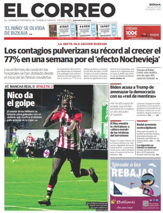 EL CORREO: "Los contagios pulverizan su récord al crecer el 77% en una semana por el 'efecto Nochevieja'"; "Biden acusa a Trump de amenazar la democracia con su "red de mentiras""; "El Rey ensalza la "fortaleza" y "altura moral" de las víctimas del terrorismo"; "Nadal arremete contra Djokovic"; "Los migrantes en tránsito se duplican".