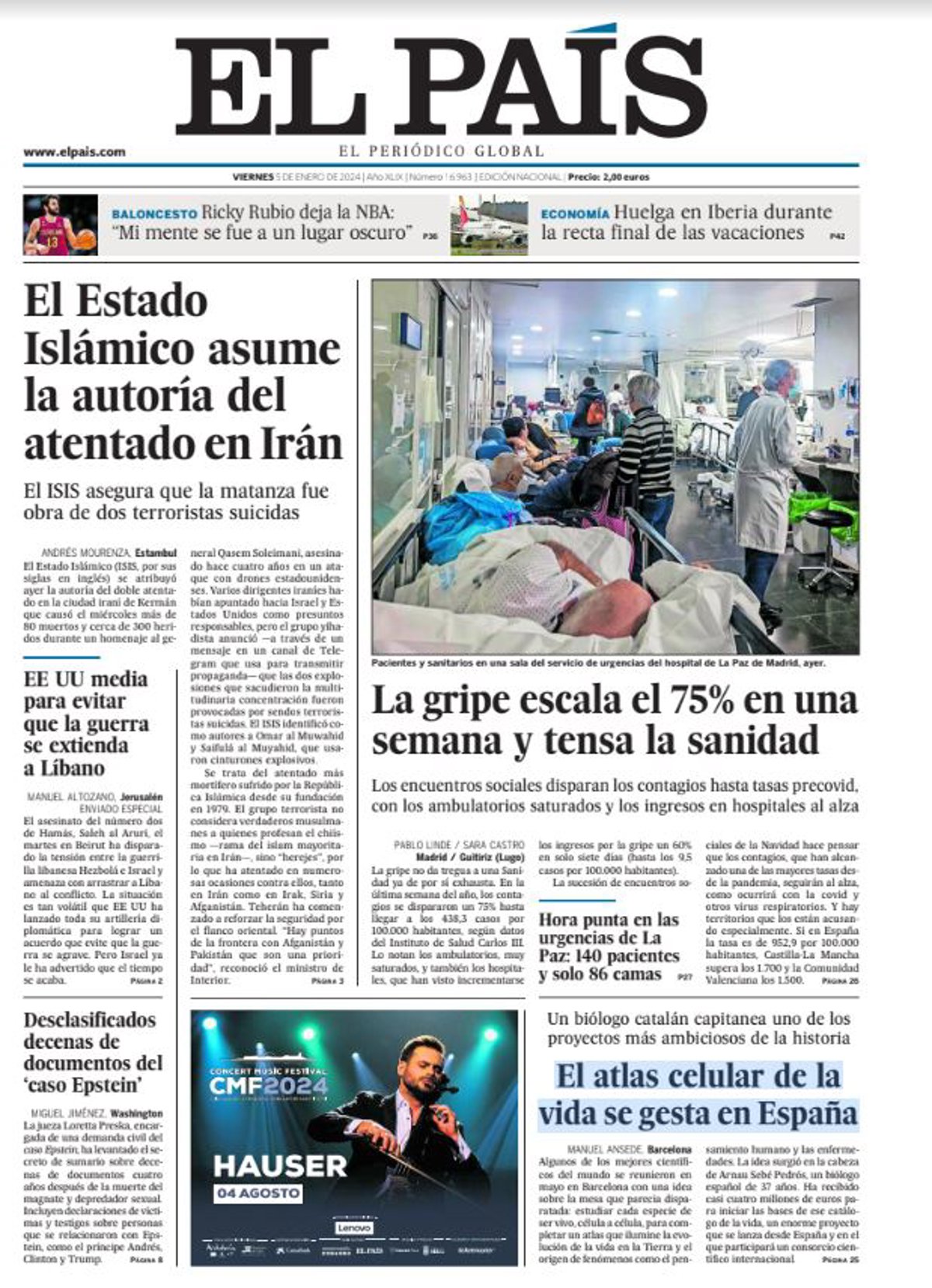 EL PAÍS: "El Estado Islámico asume la autoría del atentado en Irán"; "EEUU media para evitar que la guerra se extienda a Líbano"; "La gripe escala el 75% en una semana y tensa la sanidad"; "Desclasificados decenas de documentos del 'caso Epstein'"; "El atlas celular de la vida se gesta en España".