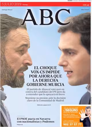 ABC: "El choque Vox-Cs impide por ahora que la derecha gobierne Murcia. El partido de Abascal votó ayer en contra del candidato del PP, pero da entender que lo apoyará en breve. Mantiene su presión ante la decisión clave de Madrid".