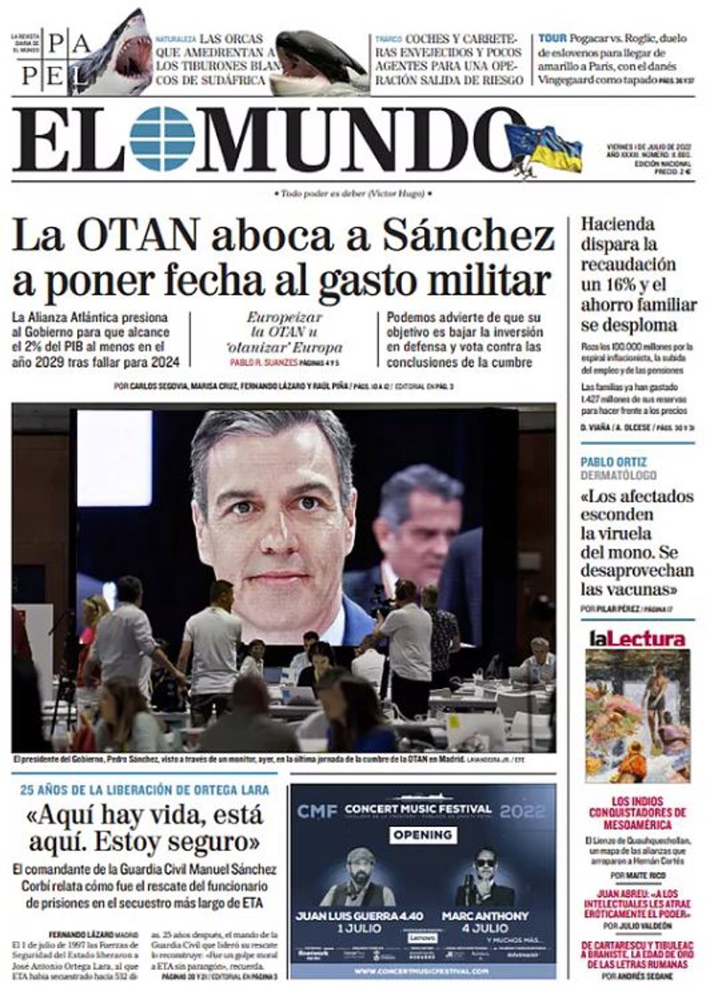 EL MUNDO: "La OTAN aboca a Sánchez a poner fecha al gasto militar"; ""Aquí hay vida, está aquí. Estoy seguro""; "Hacienda dispara la recaudación un 16% y el ahorro familiar se desploma"; "Pablo Ortiz, dermátologo: "Los afectados esconden la viruela del mono. Se desaprovechan las vacunas"".