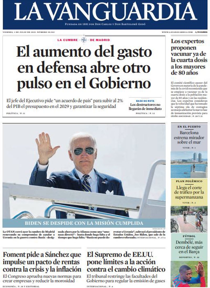 LA VANGUARDIA: "El aumento del gasto en defensa abre otro pulso en el Gobierno"; "Foment pide a Sánchez que impulse un pacto de rentas contra la crisis y la inflación"; "El Supremo de EE.UU. pone límites a la acción contra el cambio climático"; "Los expertos proponen vacunar ya de la cuarta dosis a los mayores de 80 años".