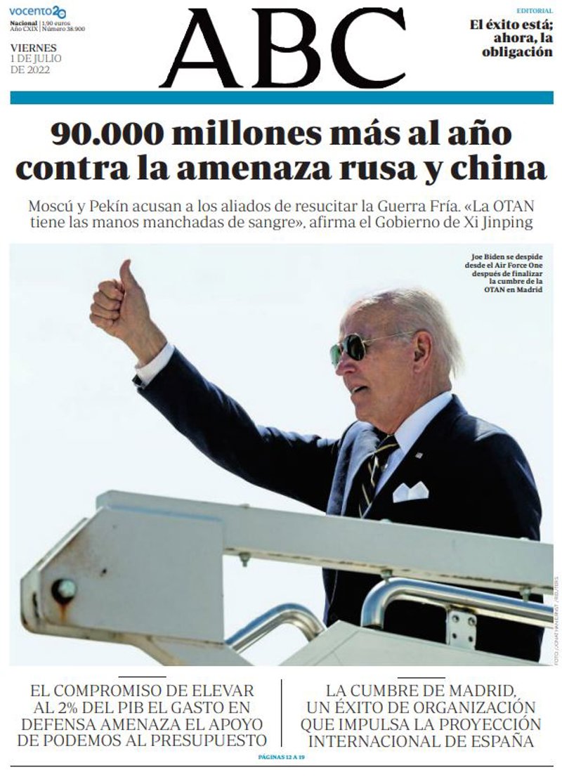ABC: "90.000 millones más al año contra la amenaza rusa y china. Moscú y Pekín acusan a los aliados de resucitar la Guerra Fría. "La OTAN tiene las manos manchadas de sangre", afirma el Gobierno de Xi Jinping".