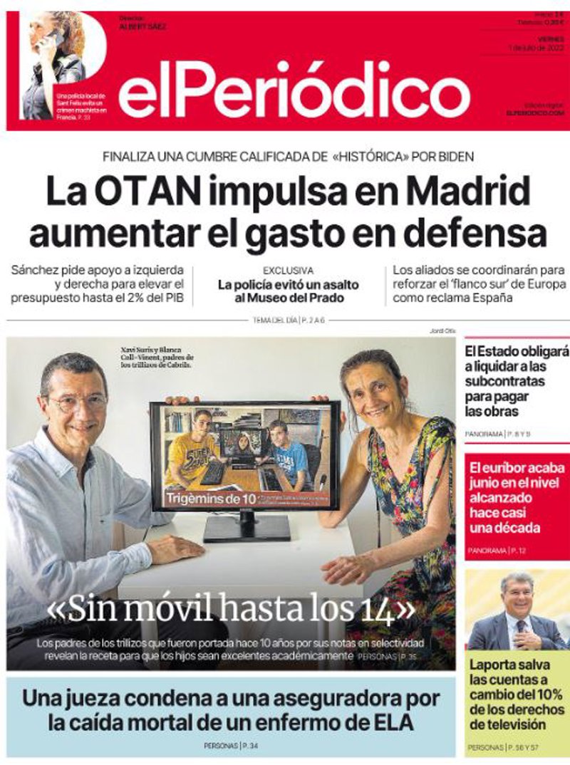 EL PERIÓDICO: "La OTAN impulsa en Madrid aumentar el gasto en defensa"; ""Sin móvil hasta los 14""; "Una jueza condena a una aseguradora por la caída mortal de un enfermo de ELA"; "El Estado obligará a liquidar a las subcontratas para pagar las obras"; "El euríbor acaba en junio en el nivel alcanzado hace casi una década"; "Laporta salva las cuentas a cambio del 10% de los derechos de televisión".