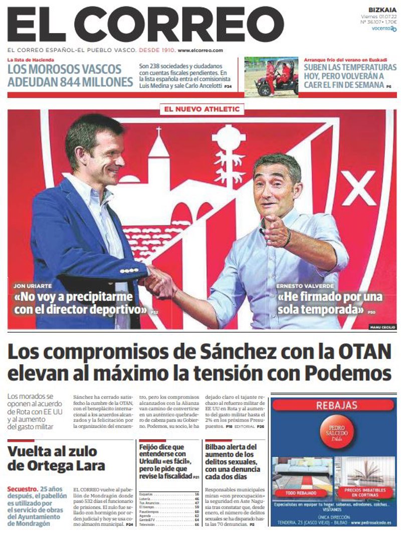 EL CORREO: "Los compromisos de Sánchez con la OTAN elevan al máximo la tensión con Podemos"; "Vuelta al zulo de Ortega Lara"; "Feijóo dice que entenderse con Urkullu "es fácil", pero le pide que revise la fiscalidad"; "Bilbao alerta del aumento de los delitos sexuales, con una denuncia cada dos días".