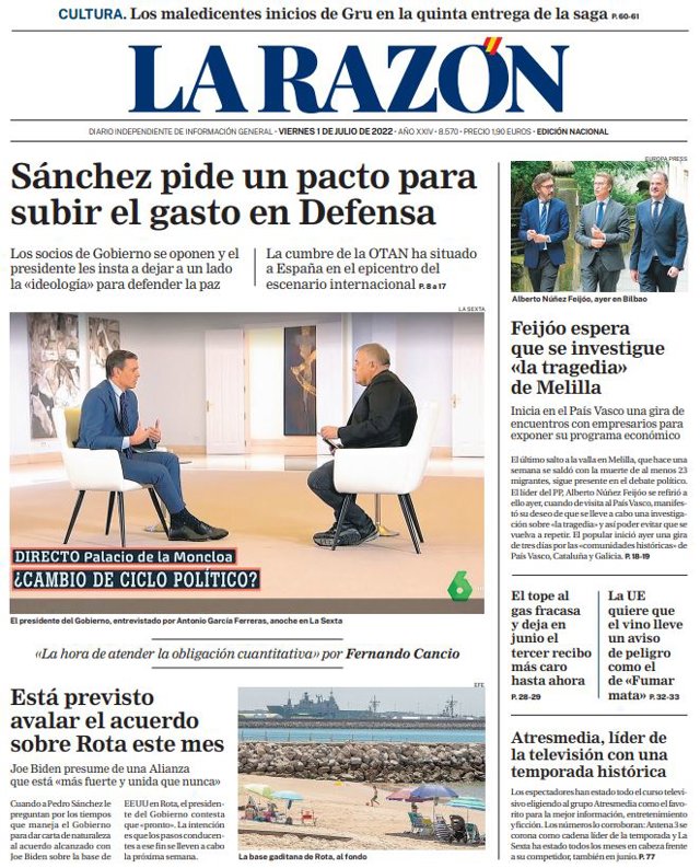 LA RAZÓN: "Sánchez pide un pacto para subir el gasto en Defensa"; "Está previsto avalar el acuerdo sobre Rota este mes"; "Feijóo espera que se investigue "la tragedia" de Melilla"; "El tope al gas fracasa y deja en junio el tercer recibo más caro hasta ahora"; "La UE quiere que el vino lleve un aviso de peligro como el de "Fumar mata""; "Atresmedia, líder de la televisión con una temporada histórica".