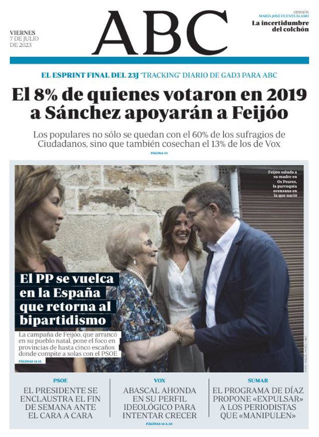 ABC: "El 8% de quienes votaron en 2019 a Sánchez apoyarán a Feijóo"; "El PP se vuelca en la España que retorna al bipartidismo".