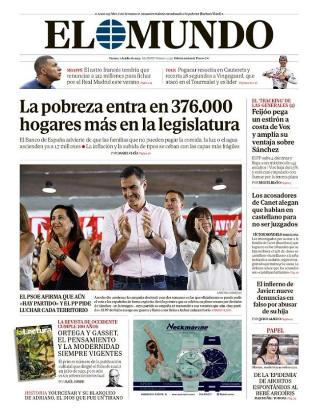 EL MUNDO: "La pobreza entra en 376.000 hogares más en la legislatura"; "Feijóo pega un estirón a costa de Vox y amplía su ventaja sobre Sánchez"; "Los acosadores de Canet alegan que hablan en castellano para no ser juzgados"; "El infierno de Javier: nueve denuncias en falso por abusar de su hija".