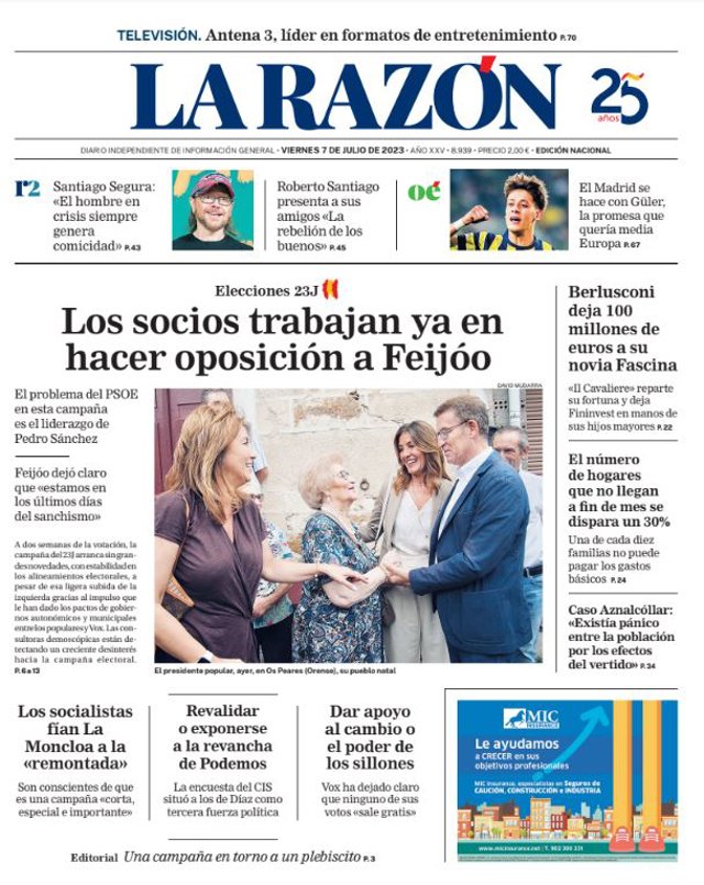 LA RAZÓN: "Los socios trabajan ya en hacer oposición a Feijóo"; "Berlusconi deja 100 millones de euros a su novia Fascina"; "El número de hogares que no llegan a fin de mes se dispara un 30%"; "Caso Aznalcóllar: Existía pánico entre la población por los efectos