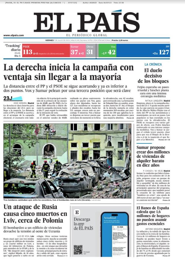 EL PAÍS: "La derecha inicia la campaña con ventaja sin llegar a la mayoría"; "Un ataque de Rusia causa cinco muertos en Lviv, cerca de Polonia"; "Sumar propone crear dos millones de viviendas de alquiler barato en diez años"; "El Banco de España calcula que 1,6 millones de hogares no pueden asumir gastos esenciales".
