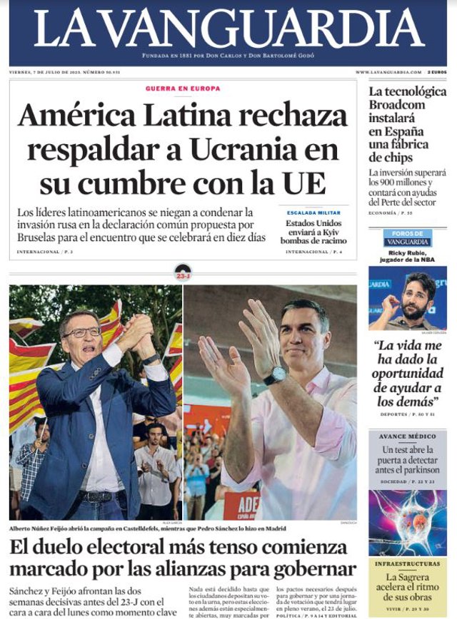 LA VANGUARDIA: "América Latina rechaza respaldar a Ucrania en su cumbre con la UE"; "El duelo electoral más tenso comienza marcado por las alianzas para gobernar"; "La tecnológica Broadcom instalará en España una fábrica de chips".