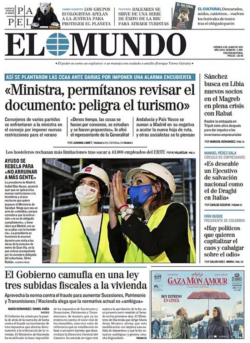 EL MUNDO: ""Ministra, permítanos revisar el documento: peligra el turismo""; "El Gobierno camufla en una ley tres subidas fiscales a la vivienda"; "Sánchez busca en Libia nuevos socios en el Magreb en plena crisis con Rabat"; "Manuel Pérez-Sala, Círculo de Empresarios: "Es deseable un Ejecutivo de salvación nacional como el de Draghi en Italia""; "Iván Duque, presidente de Colombia: "Hay políticos que quieren capitalizar el caos y cabalgar sobre el odio"".