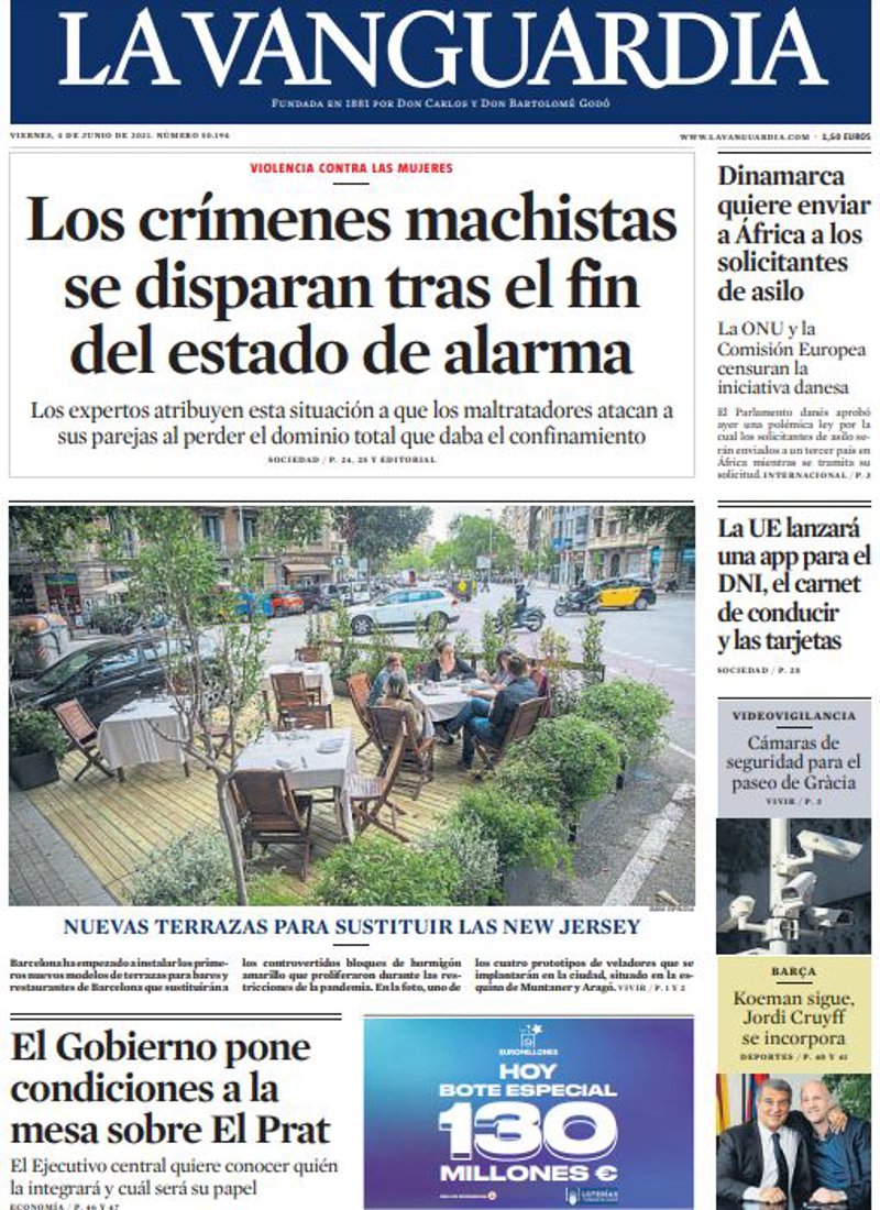 LA VANGUARDIA: "Los crímenes machistas se disparan tras el fin del estado de alarma"; "El Gobierno pone condiciones a la mesa sobre El Prat"; "Dinamarca quiere enviar a África a los solicitantes de asilo"; "La UE lanzará una app para el DNI, el carnet de conducir y las tarjetas".