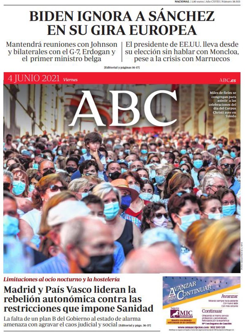 ABC: "Biden ignora a Sánchez en su gira europea. Mantendrá reuniones con Johnson y bilaterales con el G-7, Erdogan y el primer ministro belga. El presidente de EE.UU. lleva desde su elección sin hablar con Moncloa, pese a la crisis con Marruecos"; "Madrid y País Vasco lideran la rebelión autonómica contra las restricciones que impone Sanidad. La falta de un plan B del Gobierno al estado de alarma amenaza con agravar el caos judicial y social".