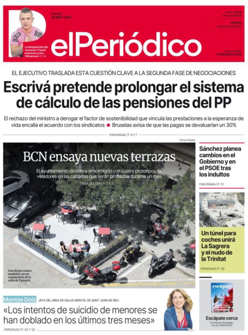 EL PERIÓDICO: "Escrivá pretende prolongar el sistema de cálculo de las pensiones del PP"; "BCN ensaya nuevas terrazas"; "Montse Doiz, jefa del área de Salud Mental de Sant Joan de Deu: "Los intentos de suicidio de menores se han doblado en los últimos tres meses""; "Sánchez planea cambios en el Gobierno y en el PSOE tras los indultos"; "Un túnel para coches unirá La Sagrera y el nudo de la Trinitat".