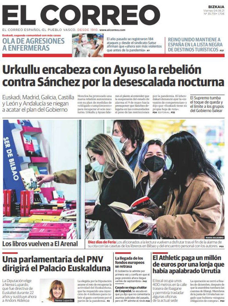 EL CORREO: "Urkullu encabeza con Ayuso la rebelión contra Sánchez por la desescalada nocturna"; "Una parlamentaria del PNV dirigirá el Palacio Euskalduna"; "La llegada de los fondos europeos se retrasa"; "Casado se niega a hablar de Cospedal"; "El Athletic paga un millón de euros por una lonja que había apalabrado Urrutia".