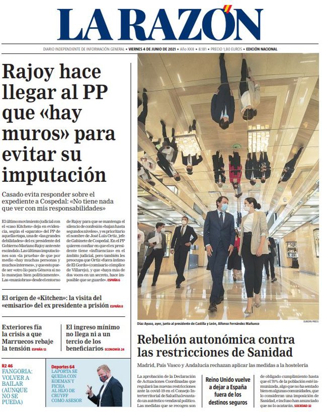 imputación"; "El origen de "Kitchen": la visita del "emisario" del ex presidente a prisión"; "Exteriores fía la crisis a que Marruecos rebaje la tensión"; "El ingreso mínimo no llega ni a un tercio de los beneficiarios"; "Rebelión autonómica contra las restricciones de Sanidad"; "Reino Unido vuelve a dejar a España fuera de los destinos seguros".