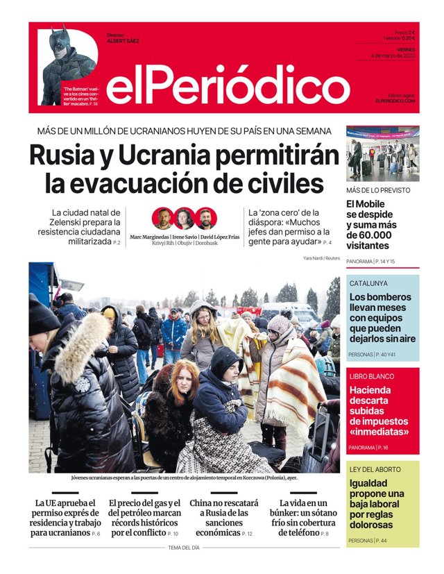 EL PERIÓDICO: "Rusia y Ucrania permitirán la evacuación de civiles"; "El Mobile se despide y suma más de 60.000 visitantes: "Los bomberos llevan meses con equipos que pueden dejarlos sin aire"; "Hacienda descarta subidas de impuestos inmediatas"; "Igualdad propone una baja laboral por reglas doloras"; "La UE aprueba el permiso exprés de residencia y trabajo para ucranianos"; "El precio del gas y el del petróleo marcan récords históricos por el conflicto"; "China no rescatará a Rusia de las sanciones económicas"; "La vida en un búnker: un sótano frío sin cobertura de teléfono".