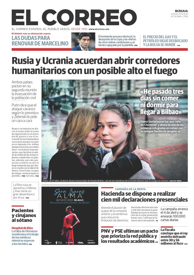 EL CORREO: "Rusia y Ucrania acuerdan abrir contenedores humanitarios con un posible alto el fuego"; "Pacientes y cirujanos al sótano"; "Hacienda se dispone a realizar cien mil declaraciones presenciales"; "PNV y PSE ultiman un pacto que prioriza la red pública y los resultados académicos"; "La Fiscalía concluye que el rey emérito defraudó entre 30 y 56 millones al fisco".