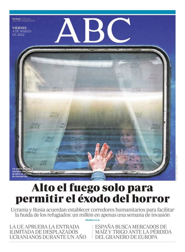 ABC: "Alto el fuego solo para permitir el éxodo del horror"; "La UE aprueba la entrada ilimitada de desplazos ucranianos durante un año"; "España busca mercados de maíz y trigo ante la pérdida del granero de Europa".