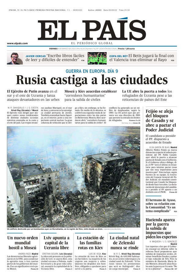 EL PAÍS: "Rusia castiga a las ciudades"; "Feijóo se aleja del bloqueo de Casado y se abre a pactar el Poder Judicial"; "Un nuevo orden mundial hostial a Moscú"; "Lviv apunta a capital de la Ucrania libre"; "La estación de las familias rotas en Kiev"; "La ciudad natal de Zelenski nunca se rinde"; "Hacienda aparca por la guerra la subida de impuestos que piden los expertos".
