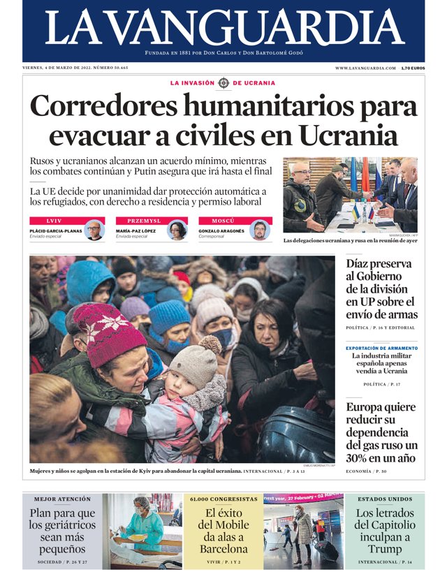 LA VANGUARDIA: "Corredores humanitarios para evacuar a civiles en Ucrania"; "Díaz preserva al Gobierno de la división en UP sobre el envío de armas"; "Europa quiere reducir su dependencia del gas ruso un 30% en un año".