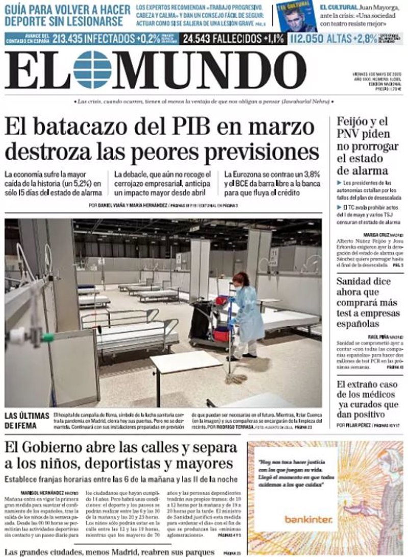 EL MUNDO: "El batacazo del PIB en marzo destroza las peores previsiones"; "El Gobierno abre las calles y separa a los niños, deportistas y mayores"; "Las grandes ciudades, menos Madrid, reabren sus parques"; "Feijóo y el PNV piden no prorrogar el estado de alarma"; "Sanidad dice ahora que comprará más test a empresas españolas"; "El extraño caso de los médicos ya curados que dieron positivo".
