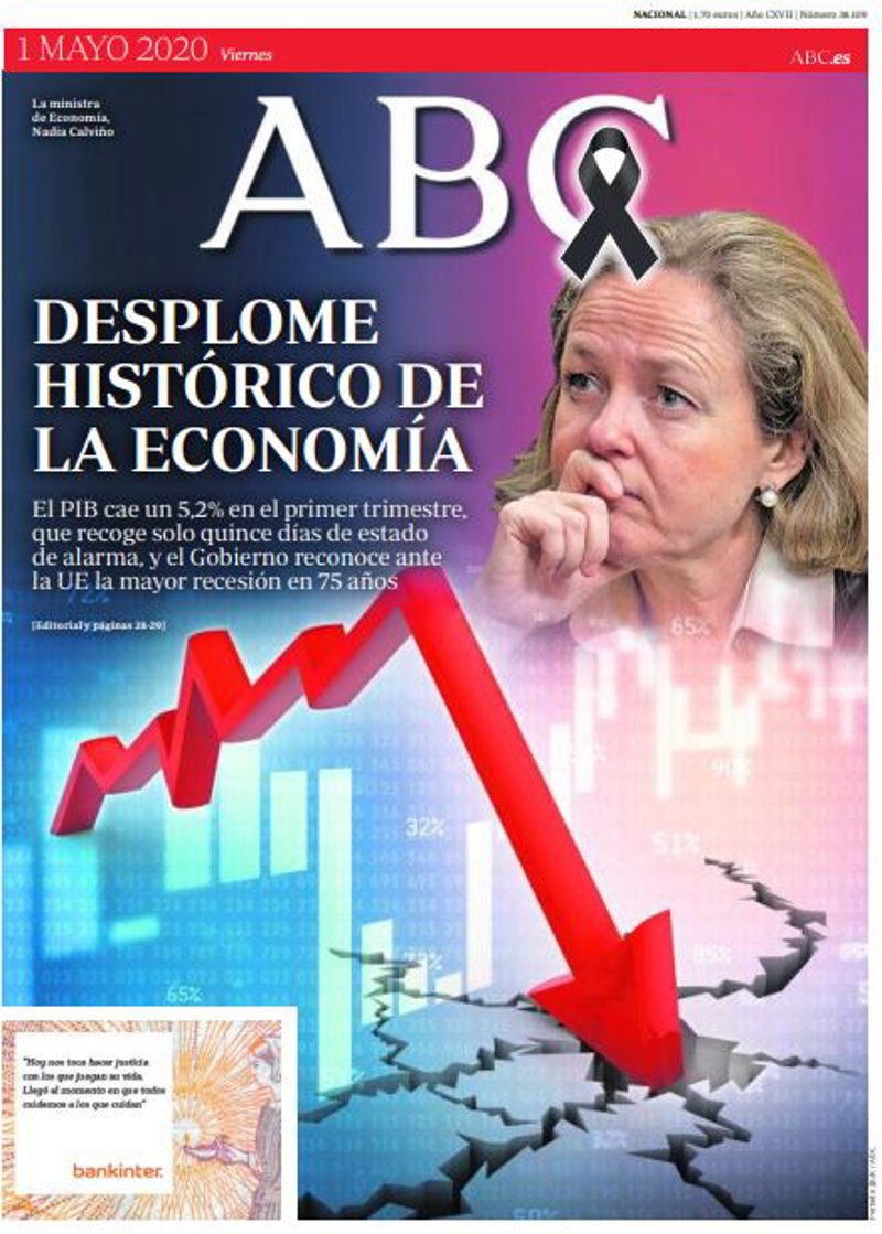 ABC: "Desplome histórico de la economía. El PIB cae un 5,2% en el primer trimestre, que recoge solo quince días de estado de alarma, y el Gobierno reconoce ante la UE la mayor recesión en 75 años."