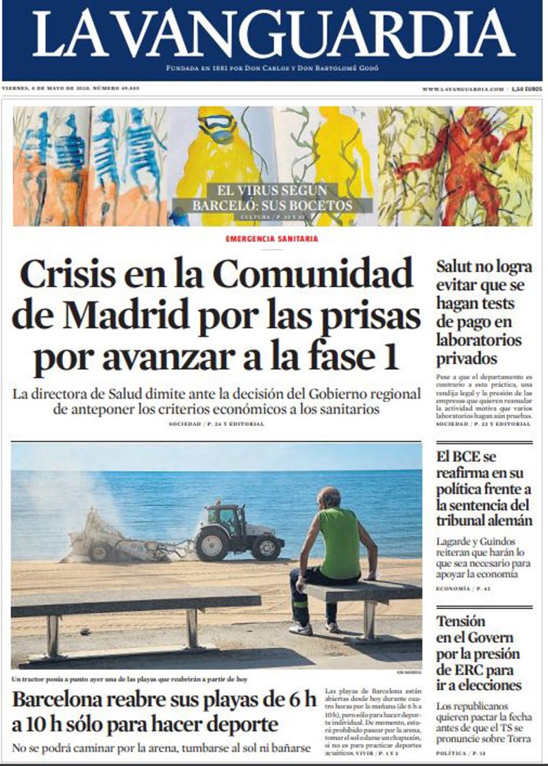 LA VANGUARDIA: "Crisis en la Comunidad de Madrid por las prisas por avanzar a la fase 1"; "Barcelona reabre sus playas de 6h a 10h sólo para hacer deporte"; "Salut no logra evitar que se hagan tests de pago en laboratorios privados"; "El BCE se reafirma en su política frente a la sentencia del tribunal alemán"; "Tensión en el Govern por la presión de ERC para ir a elecciones".
