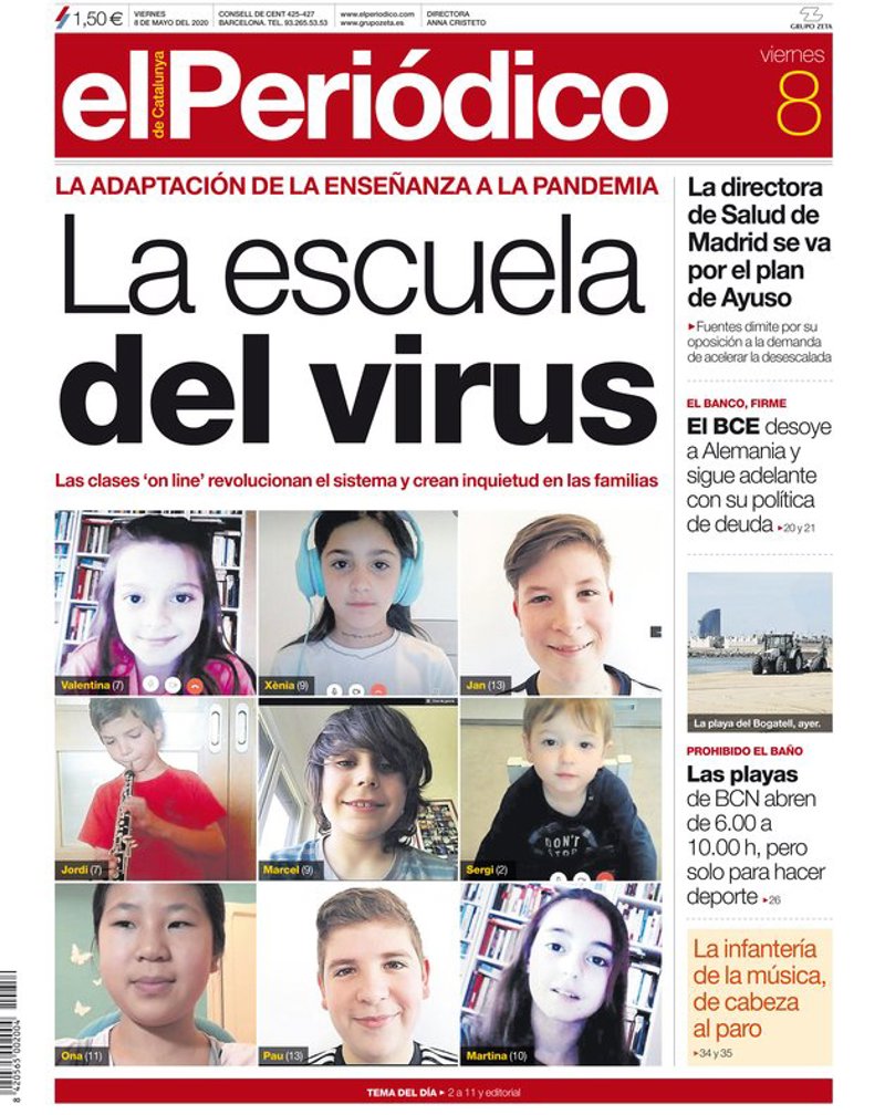 EL PERIÓDICO: "La escuela del virus. Las clases 'on line' revolucionan el sistema y crean inquietud en las familias"; "La directora de Salud de Madrid se va por el plan de Ayuso"; "El BCE desoye a Alemania y sigue adelante con su política de deuda"; "Las playas de Barcelona abren de 6.00 a 10.00 horas, pero solo para hacer deporte".