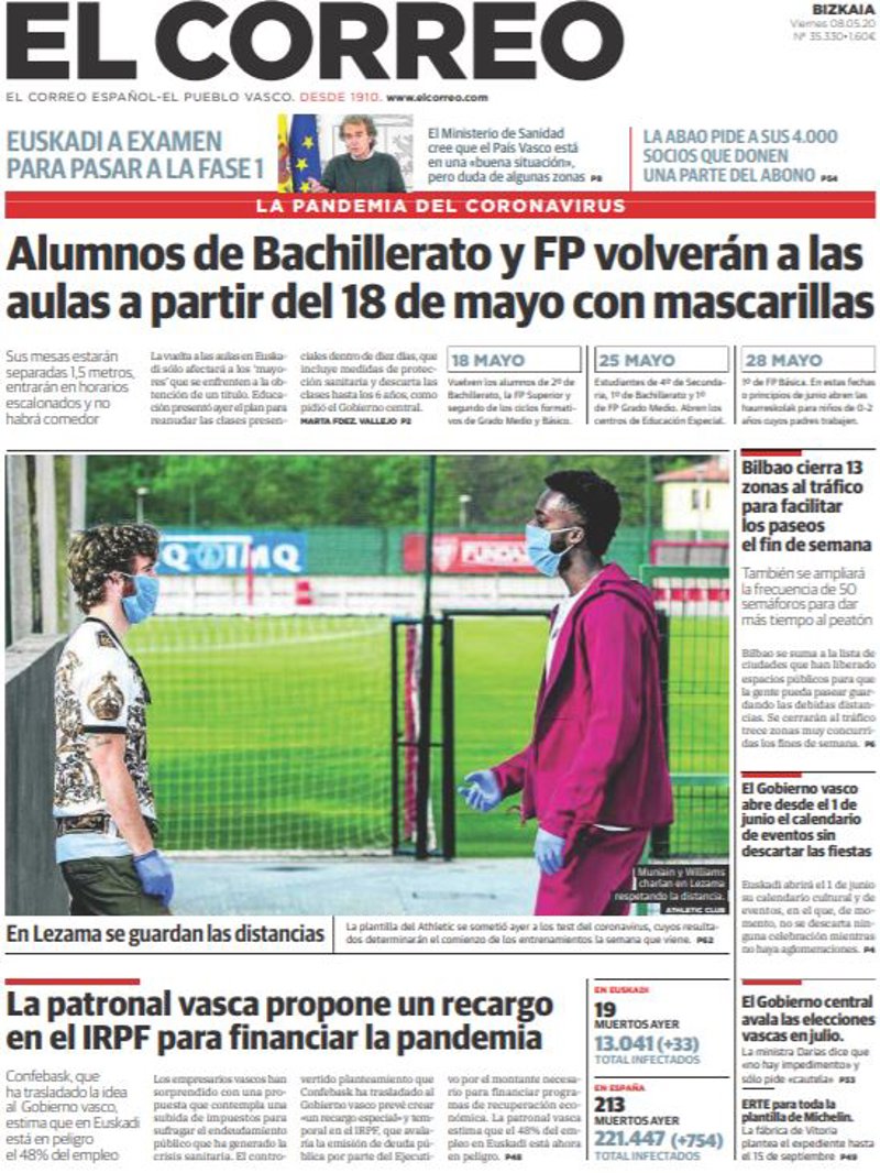 EL CORREO: "Alumnos de Bachillerato y FP volverán a las aulas a partir del 18 de mayo con mascarillas"; "La patronal vasca propone un recargo en el IRPF para financiar la pandemia"; "Bilbao cierra 13 zonas al tráfico para facilitar los paseos el fin de semana"; "El Gobierno vasco abre desde el 1 de junio el calendario de eventos sin descartar las fiestas"; "El Gobierno central avala las elecciones vascas en julio"; "ERTE para toda la plantilla de Michelin. La fábrica de Vitoria plantea el expediente hasta el 15 de septiembre".
