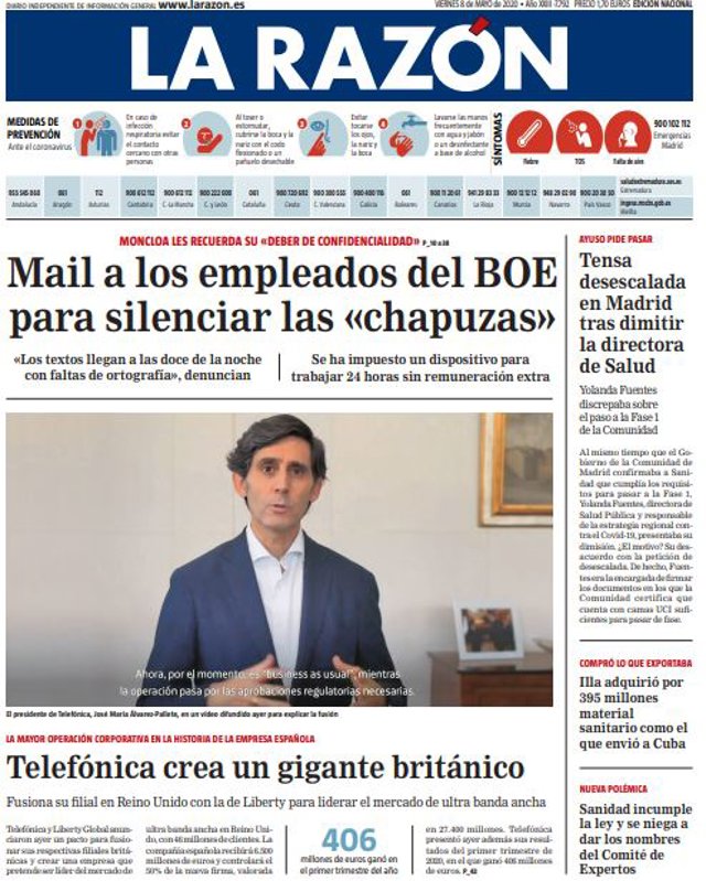 LA RAZÓN: "Mail a los empleados del BOE para silenciar las "chapuzas""; "Telefónica crea un gigante británico"; "Tensa desescalada en Madrid tras dimitir la directora de Salud"; "Illa adquirió por 395 millones material sanitario como el que envió a Cuba"; "Sanidad incumple la ley y se niega a dar los nombres del Comité de Expertos".