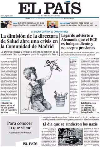 EL PAÍS: "La dimisión de la directora de Salud abre una crisis en la Comunidad de Madrid"; "Lagarde advierte a Alemania que el BCE es independiente y no acepta presiones"; "El Gobierno busca aislar al PP con pactos con Cs y agentes sociales"; "Telefónica crea con Liberty un gigante de las telecos en el Reino Unido"; "El día que se rindieron los nazis. La capitulación alemana hace 75 años marcó el fin del conflicto en Europa y el inicio del doloroso y generoso esfuerzo de reconstrucción".